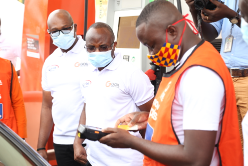 The COO of GOIL, Mr. Alex Adzew (middle), observing a GOIL service station attendant serving a client using a gh-link card device