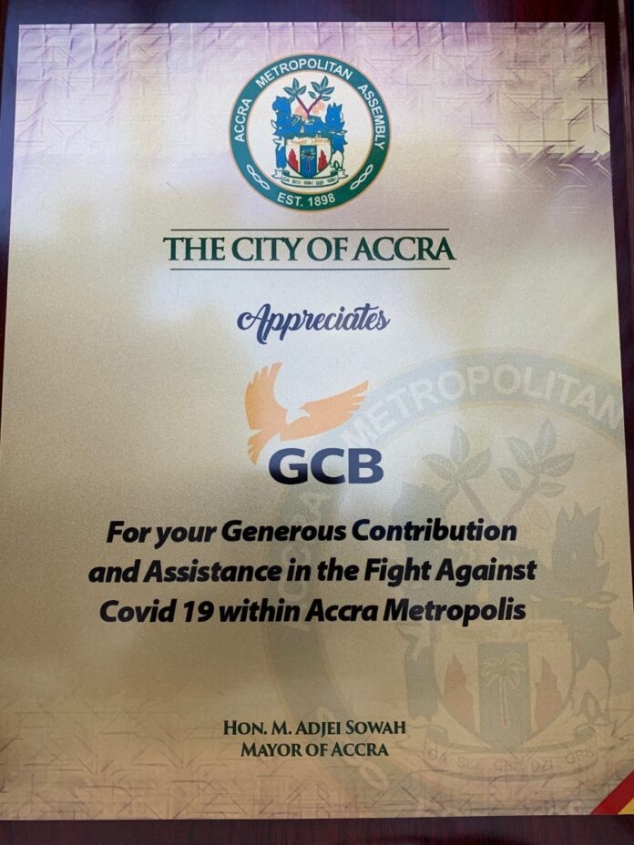GCB Bank Limited has been rewarded with a plaque by the Accra Metropolitan Assembly (AMA) for its role in the fight against the COVID-19 pandemic in the Accra Metropolis and the entire country.