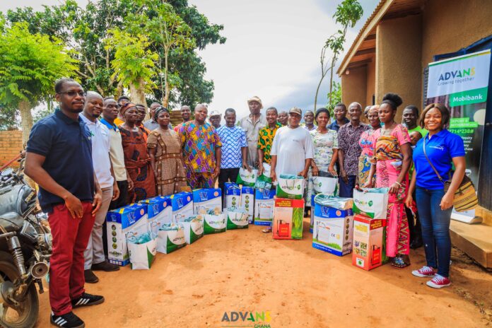 Advans Ghana distributed farm related equipment and tools worth over GHC25,000 including Advans branded knapsack sprayers, cutlasses, protective clothing, gloves, wellington boots.