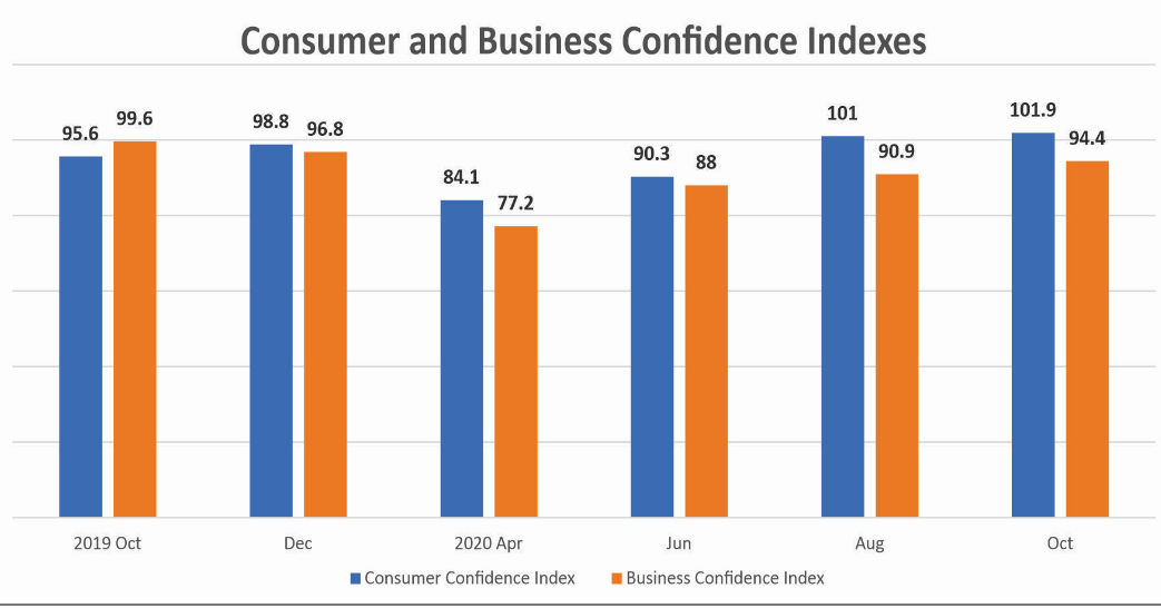 The CIEA is not the only indicator pointing to a rebounding of economic activities. Both consumer and business confidence indicators are also moving in the same direction. The Bank’s survey shows that consumer confidence in October has shot up above pre-lockdown levels, hitting 101.9 points compared to 84.1 percent in April.